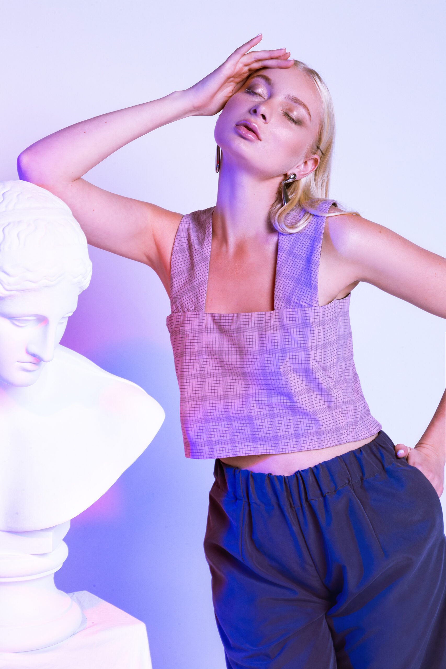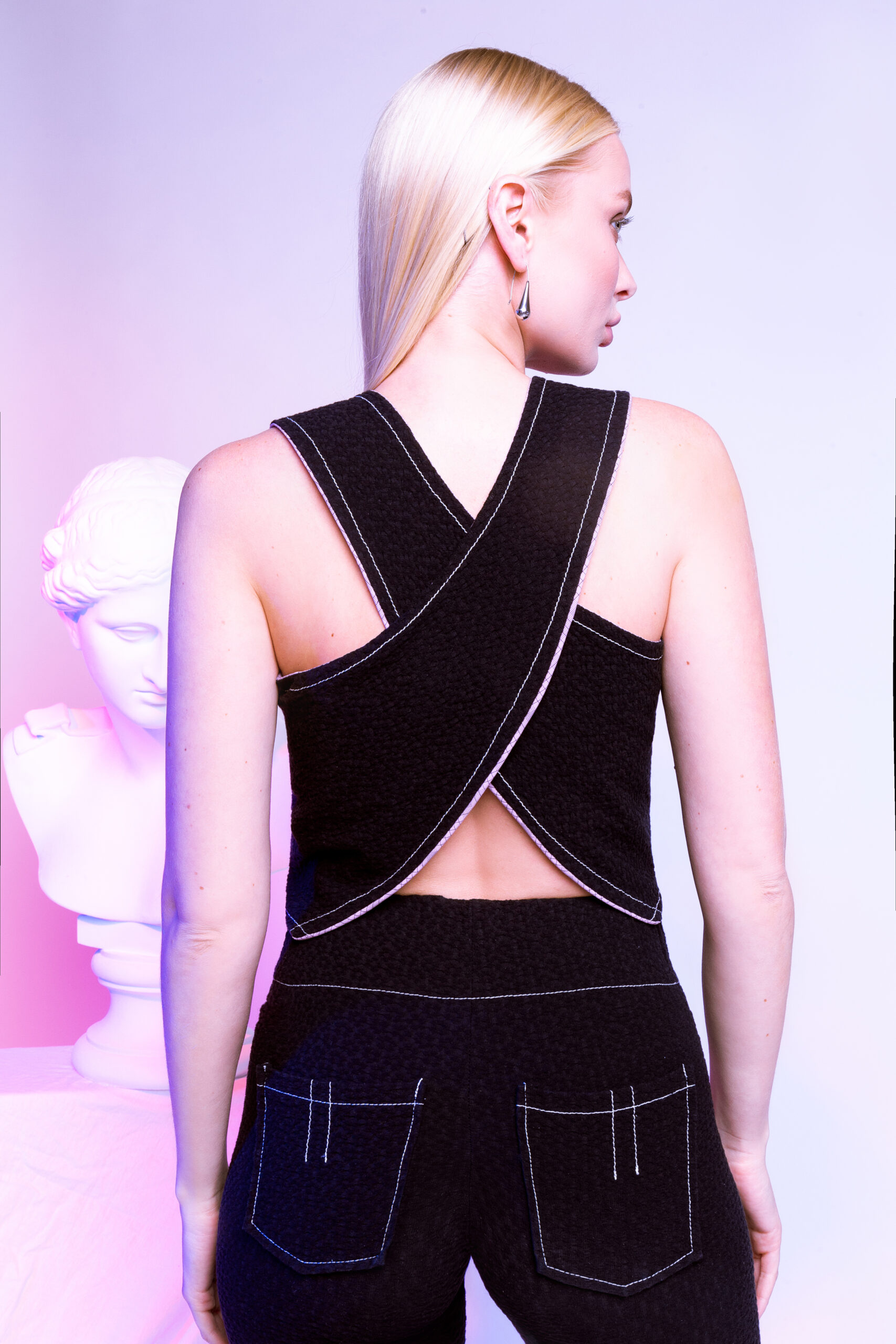 Un côté du haut comporte de larges bretelles, l’autre côté des bretelles croisées encore plus larges.