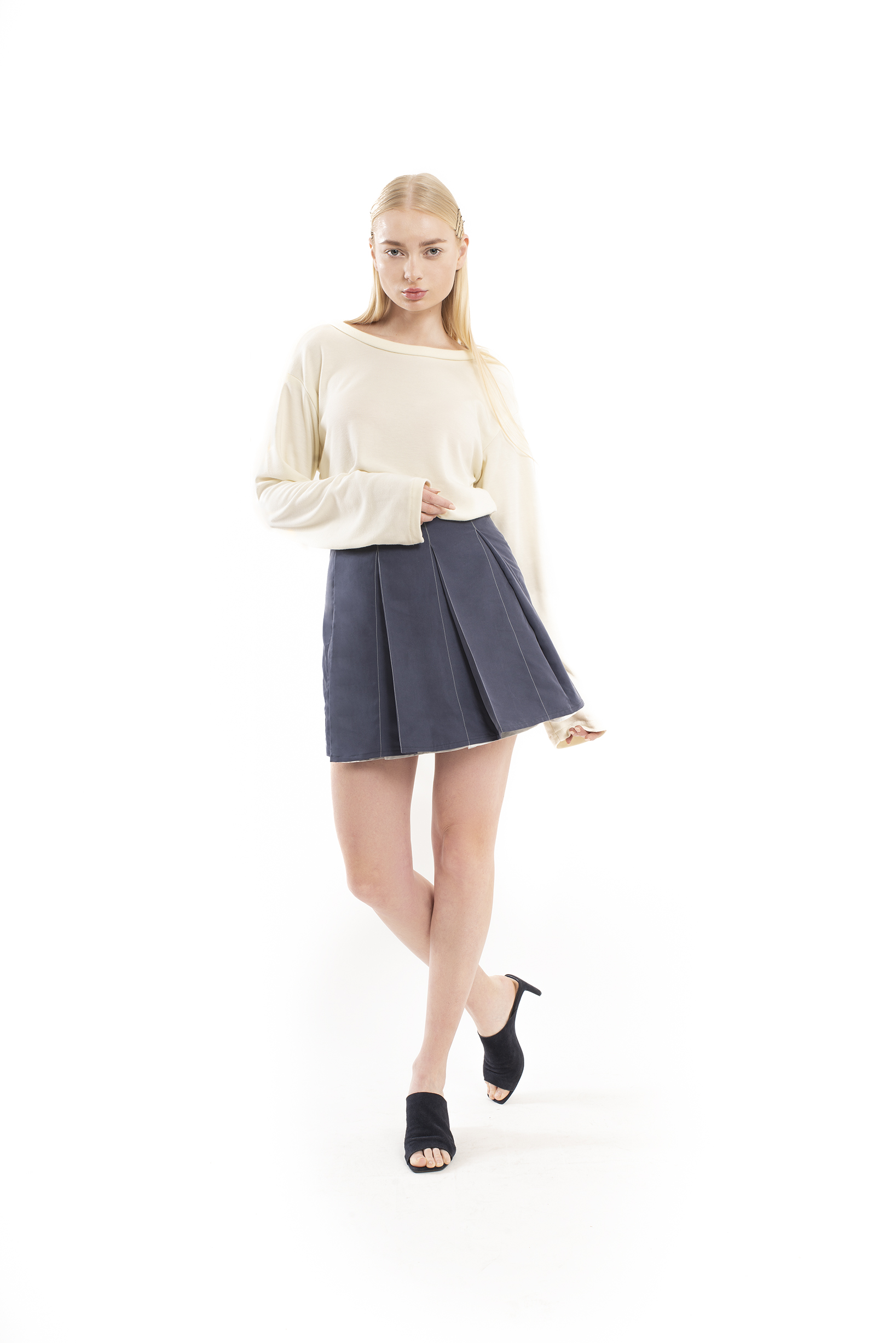 Un côté de la jupe est bleu ciel, l’autre – bleu marine.